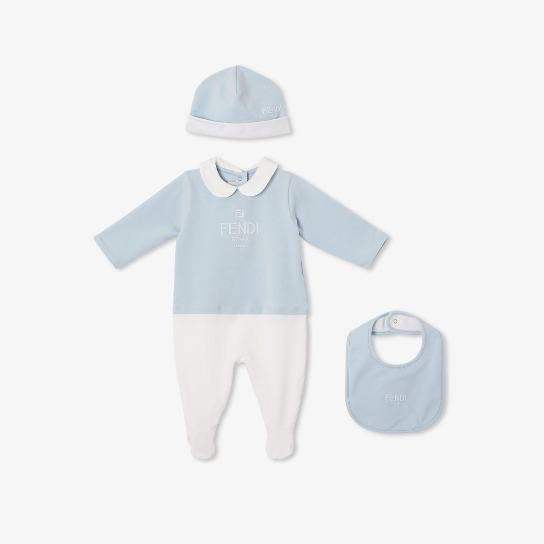 Fleece cotton baby set with white and light blue playsuit with tone-on-tone Fendi embroidery on the front, with matching light blue bib and cap.