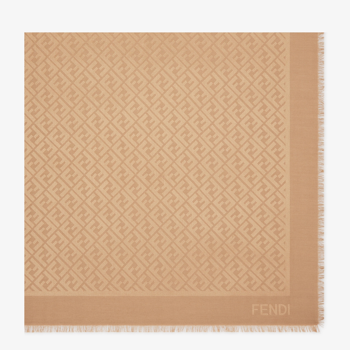 The iconic Fendi shawl is made of an organic silk and wool blend in a distinctive shade of camel. The jacquard is beautifully woven in an FF motif. Lightweight and wraparound, suitable for all seasons.