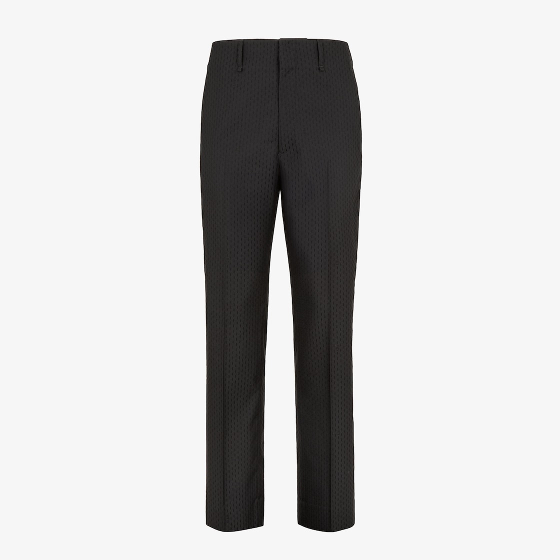 Straight-cut tailored trousers. Belt loops on the waistband and trouser crease. Side pockets and welt pockets on the back. Concealed zip fastening. Width at the hem: 22 cm. Made of black wool embellished with a jacquard weave that creates an all-over tone-on-tone topstitch effect.