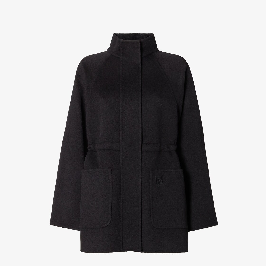 Parka-style blouson with detachable hood and adjustable internal drawstring waist. High collar, raglan sleeves and patch pockets. Concealed zip fastening with double slider. Made of black wool double fabric. Lining customised with a grey FF motif. The hood with foulard-like insert creates a double layer effect. Embellished with matching FF logo embroidered on the left pocket.
