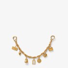 Charm in torchon chain with pendants that echo iconic Fendi elements, from the Peekaboo and Baguette bags to objects that recall Fendi’s craftsmanship and history, combined with a commemorative medal for the fashion house’s 100th anniversary. Double snap hook to attach it to handbags. Made of gold-finish metal. Perfect accessory to customise the collection bags.