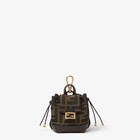 Nano backpack decorated with an FF clasp. Made of jacquard fabric with the iconic FF motif. Features a front flap, press stud button clasp and drawstring closure, with tone-on-tone leather cords and base. The clip allows it to be attached to larger bags or belts as a charm. Can be also be worn on the wrist thanks to the elasticated straps. Gold-finish metalware. It can hold a credit card, lipstick and earbuds.