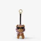 Bag charm made of brown FF microfibre. Dog-shaped charm with leather strap and customised Fendi logo snap hook. Embellished with a pink and burgundy FF foulard, black patent leather glasses and burgundy leather collar with FF tag. Gold-finish metalware. A playful and personal accessory to elegantly enrich every bag in the collection.