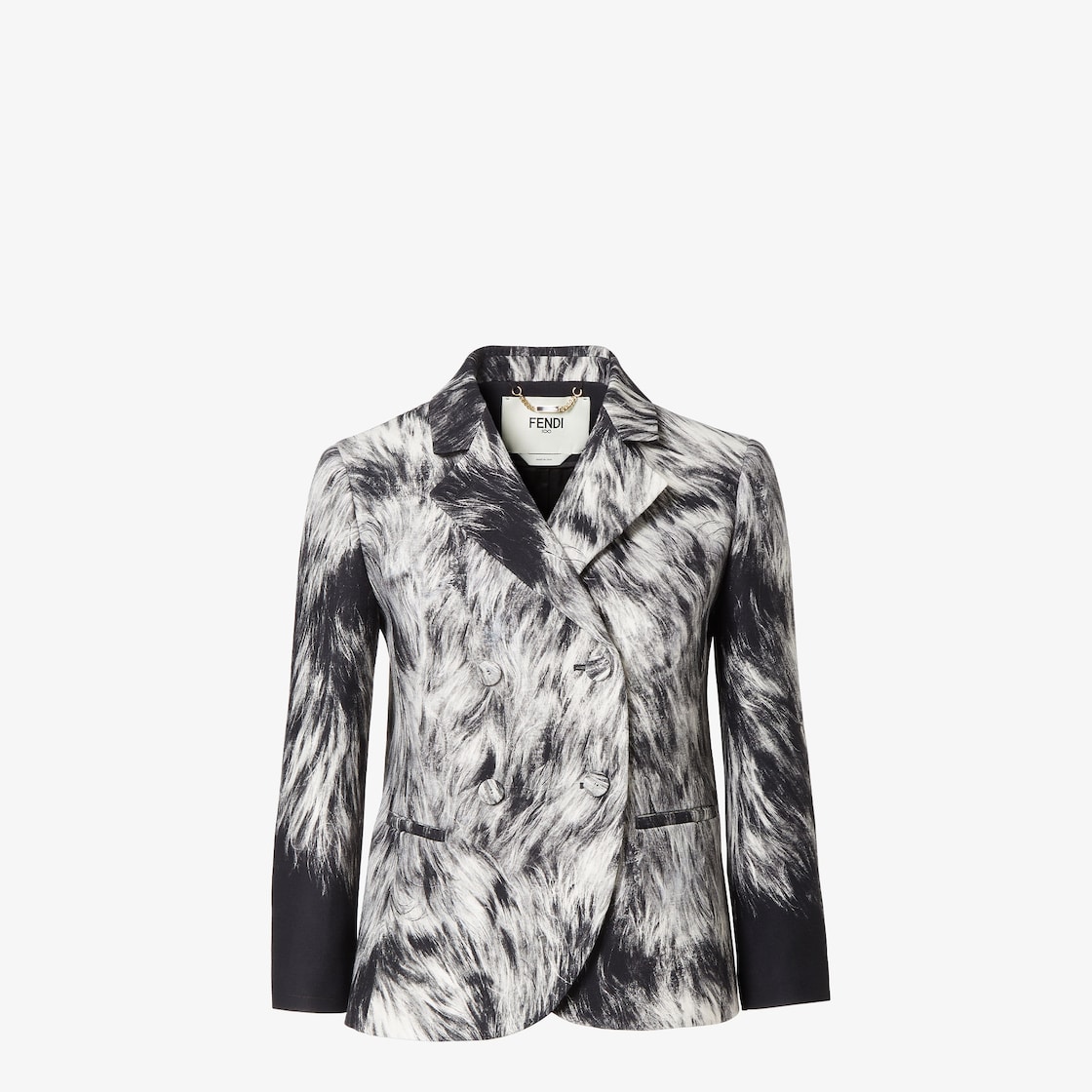 Double-breasted short jacket with 3/4 sleeves. Lapels and welt pockets on the front. Covered button fastening in matching tone. Unlined. Made of wool and silk with an exclusive Frosted Fauna motif printed all over: a nuanced reinterpretation of the timeless black and white animalier, inspired by an archive coat by Silvia Venturini Fendi.