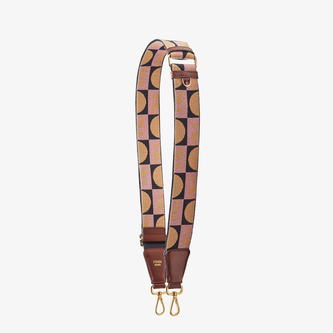 Long adjustable shoulder strap with double snap hook, to use in combination with any bag with hooks. Made of pink jacquard webbing with Fendi Dots motif, a combination of the iconic FF and Art Deco-inspired dots in different colours. Embellished with details in brown leather. Gold-finish metalware.