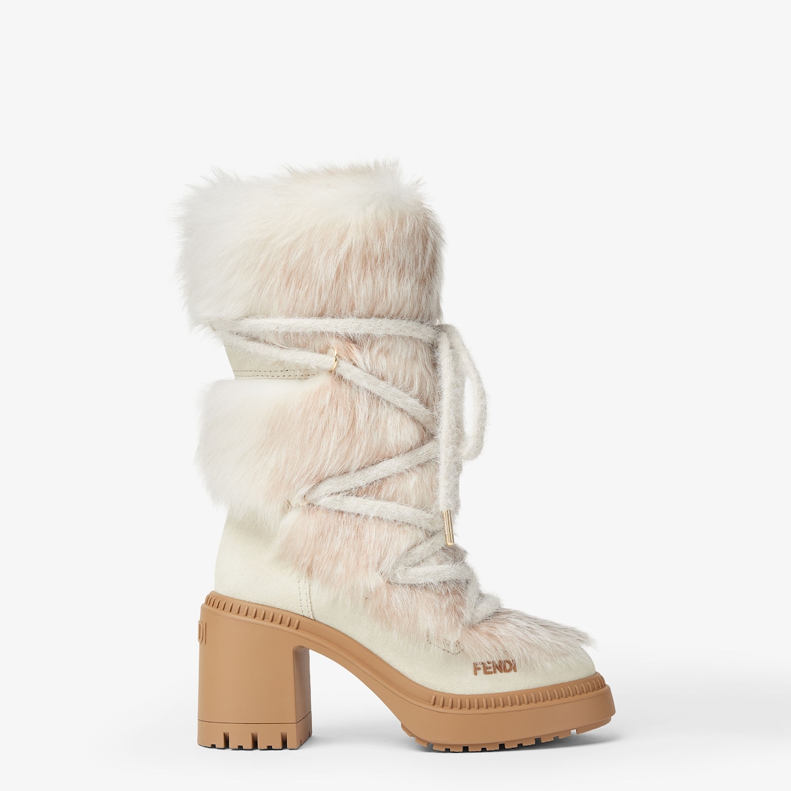 Round-toe après-ski boots. Chunky rubber sole with wide heel and embossed Fendi logo on the back. Made of white suede with toe and shaft in tone-on-tone ‘dorsato’ shearling, characterised by a trompe-l'œil effect that mimics the full, velvety texture of fox fur. Brown rubber Fendi logo on the side. Tubular laces with gold-coloured metal tips and hiking boot hooks. Gold-finish metalware.