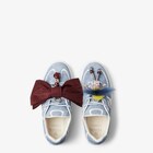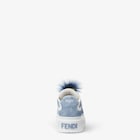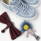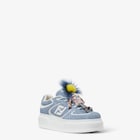 Fendi Match lace-up trainers. Made of suede with denim-effect print in light blue. White leather FF appliqués on the sides and tone-on-tone hiking laces. Rubber platform sole with oversized, embossed Fendi lettering at the back. Completed with charms attached by a metal ring onto the tongue: the right shoe is adorned with a small doll in braided cord with blue and yellow mink details and bracelets with FF motif in gold metal. On the left shoe is a macro brown taffeta bow completed by a multicoloured cord with gold-colour metal FF bead.