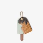 Cremino-shaped card holder made of light and dark brown inlaid alligator leather. The multicolour leather design features a gusseted opening with two internal card slots and a brown leather stick. A chain with screw mechanism also allows it to be used as a charm or attachable accessory. Gold-finish metalware.
