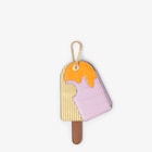 Cremino-shaped card holder made of lilac and orange inlaid alligator leather. The multicolour leather design features a gusseted opening with two internal card slots and a brown leather stick. A chain with screw mechanism also allows it to be used as a charm or attachable accessory. Gold-finish metalware.