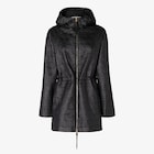 Long-sleeved parka with hood. Drawstring waist and peplum over the hips for a double layer effect. Side pockets with zip. Zip fastening with double slider. Made of black technical fabric with lightly padded and quilted with the FF motif all over. Palladium-finish metalware.