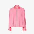 Bomber-inspired jacket with shirt collar and raglan sleeves. Slanted pockets and zip fastening. Elastic strap inserted at the hem and cuff straps, with buttonhole adjustment, to modify the fit and define the volume of the silhouette. Made of pink technical viscose fabric. Embellished with organza details on the collar and cuffs.