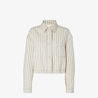 Cropped jacket with shirt collar and long sleeves. Elastic inserted at the hem with buttonhole adjustment, to modify the fit and define the volume of the silhouette. Patch pocket on the chest and two patch pockets on the back. Concealed press stud fastening. Made of beige FF denim with a light blue vertical striped motif. Embellished with contrasting topstitching and a large brown leather patch with red FF Selleria detail applied on the back.