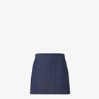 Short flared skirt. Patch pockets on the front. Full-zip fastening on the left side. Made of navy blue cotton denim. Lining with FF motif in the same colours. Embellished with contrasting stitching and brown leather backstrap with Selleria FF detail.