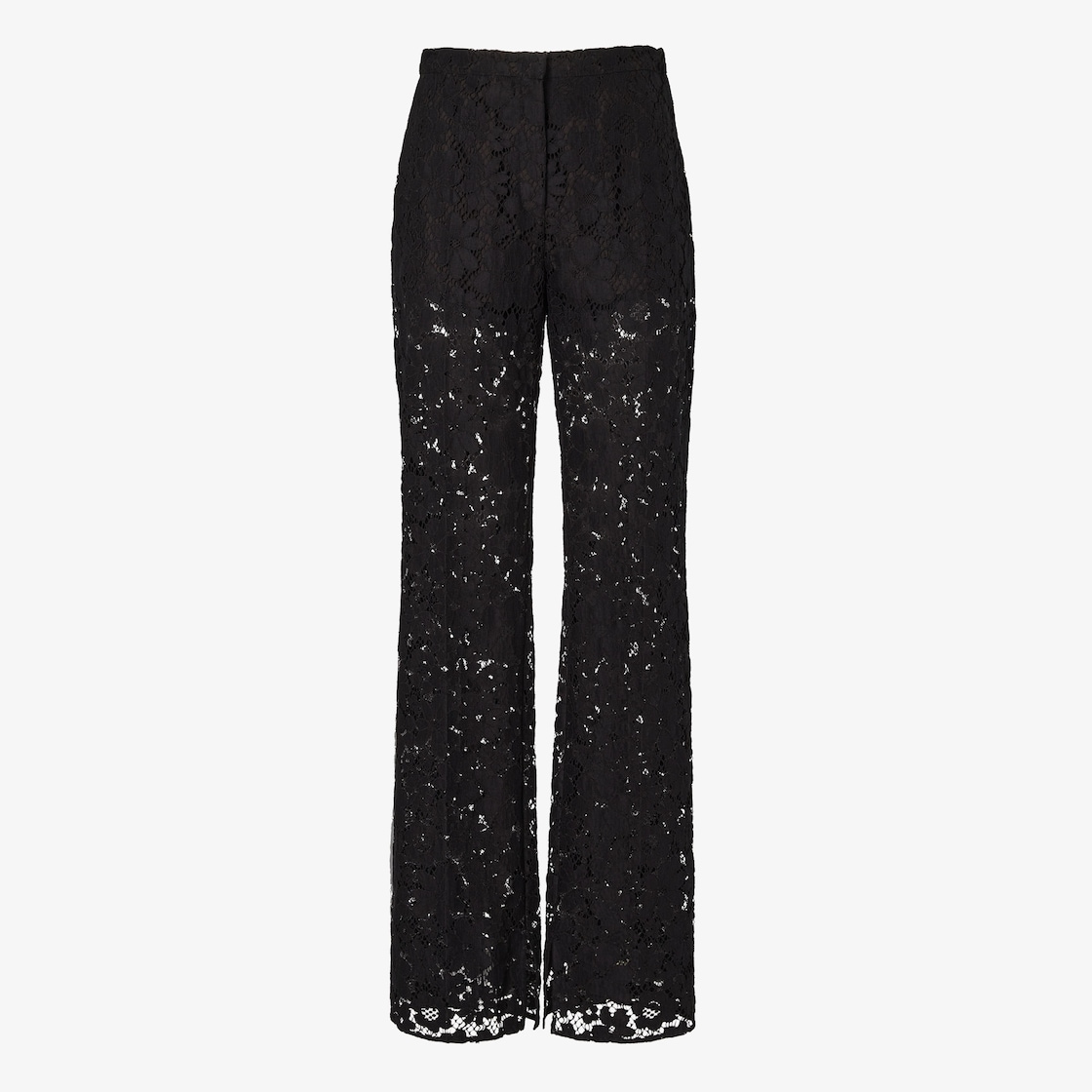 Straight-leg trousers with internal slits at the hem. Side pockets and welt pockets on the back. Concealed zip fastening. Made of black lace with an archive floral motif for a see-through effect. Garment fit can be modified using the elastic strap inserted in the back waist with buttonhole adjustment. Featuring removable culottes in the same tones.