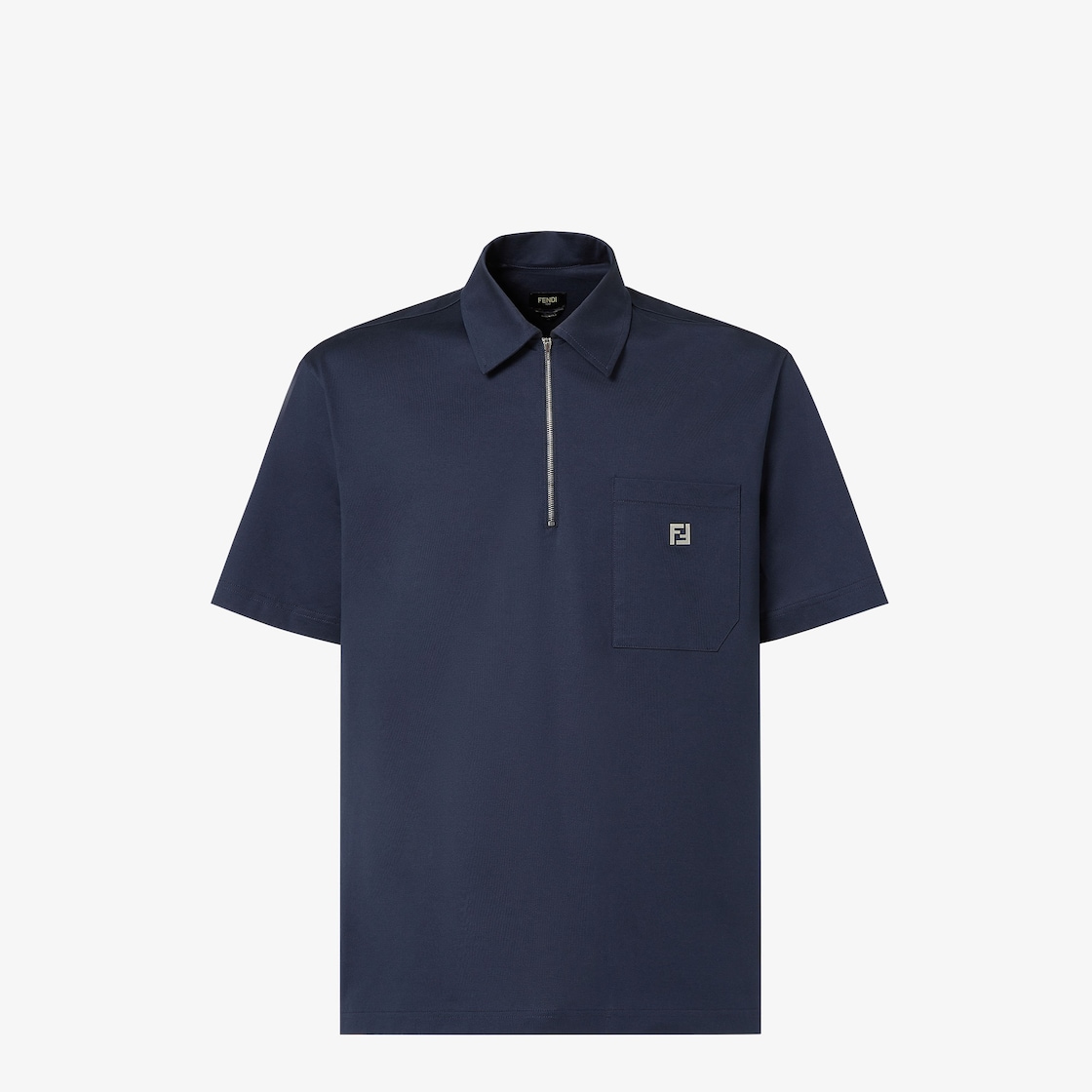 Boxy short-sleeved T-shirt. Chest pocket and polo collar with metal zip closure. Made of dark blue 100% cotton. Customised with metal micro FF on the pocket. Palladium-finish metalware.
