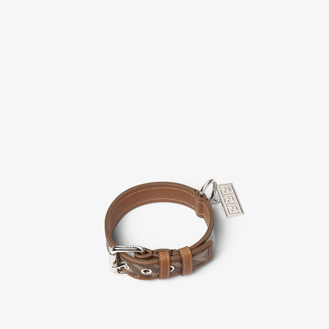 Dog collar with embossed FF customised name plate. Adjustable fastening with metal pin buckle. Made of fabric with FF motif in brown and tobacco. Leather details. Palladium-finish metalware.