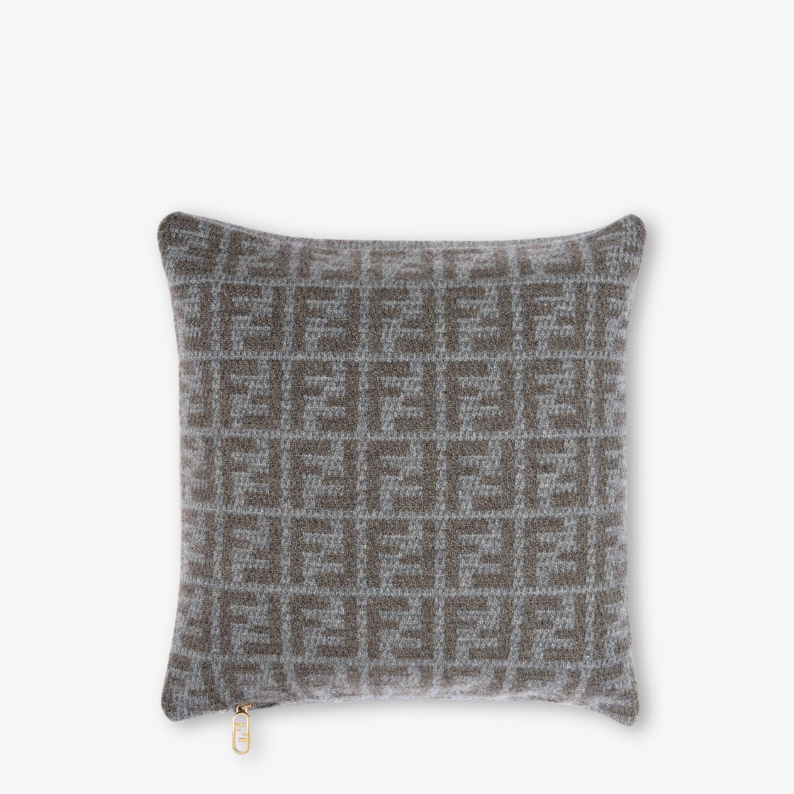 Square, two-tone soft cashmere cushion with FF motif in grey and white. Intent on consolidating the close relationship between furniture and the world of fashion, the Fendi Casa range of cushions is a tribute to the iconic Fendi FF logo designed by Karl Lagerfeld in 1965. A highly distinctive line created by the fashion house to add a refined touch of design to interior spaces.