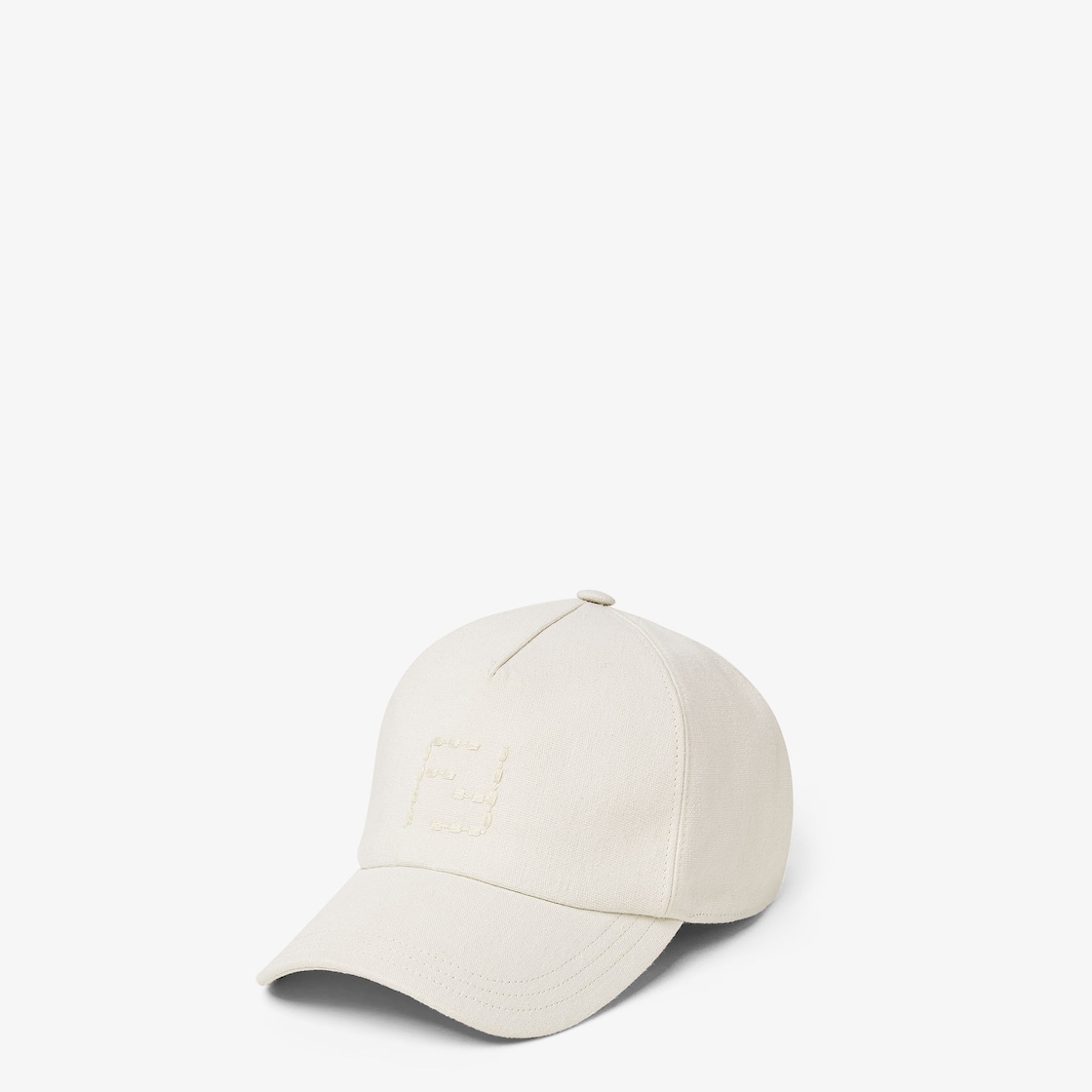 White canvas baseball cap with semi-stiff peak. Customised with a tone-on-tone topstitched FF logo on the front.