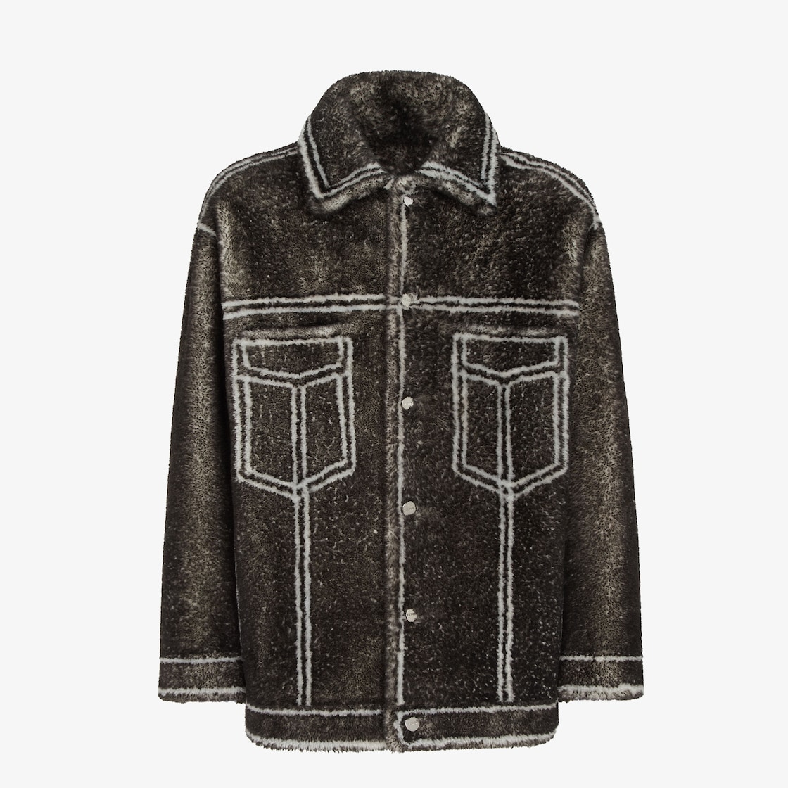 Straight-cut blouson, with shirt collar and slightly dropped shoulders. Front closure with metal buttons and buttoned cuffs. Made of shaved merino shearling embellished with a spray finish that creates trompe l’oeil-effect pockets and stitching in black. Finished with contrasting FF on the neck back. Lined.