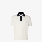 Short-sleeved polo shirt. This style has a classic collar with button fastening. Made of white viscose yarn with FF logo intarsia on the left-side hem. Finished with a dark blue collar and fastening with contrasting stitching. Ribbed cuffs and edge.