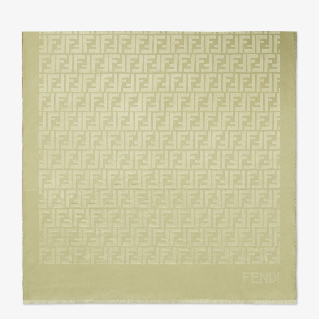 Large rectangular stole made of light green organic silk. All-over jacquard FF motif. Hand-fringed edges.
