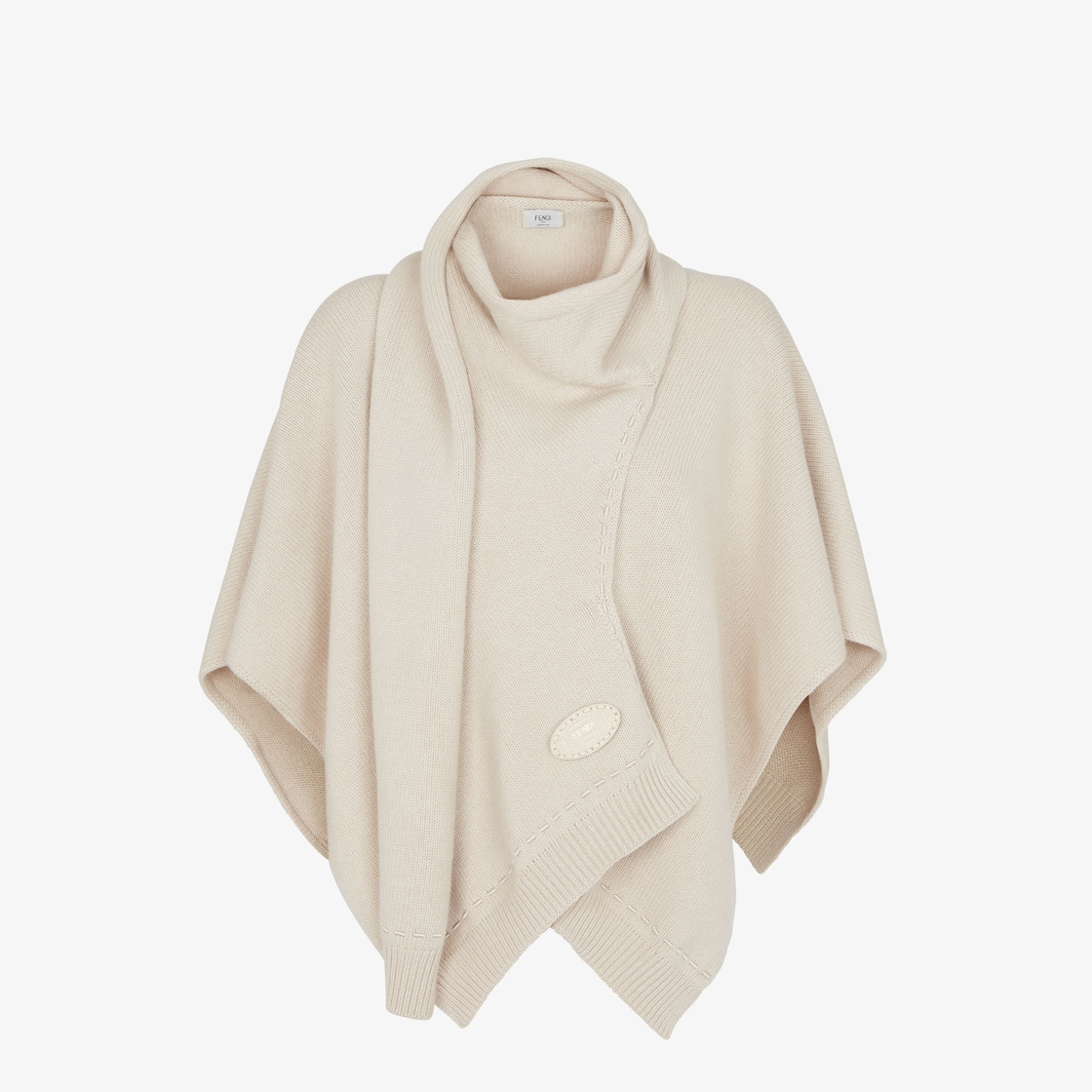 Short enveloping poncho with scarf detail. Ribbed edges. Made in a soft, camellia cashmere knit. Decorated with a Cuoio Romano leather Selleria stamp on the front and embroidery that recreates tone-on-tone Selleria macro stitches.