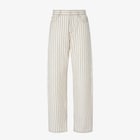 High-waisted five-pocket trousers with a wide, straight leg. Concealed zip and press-stud fastening. Made of beige FF denim with a light blue vertical striped motif. Brown leather back-strap with red FF Selleria detail. Contrasting stitching and gold-finish metal rivets.