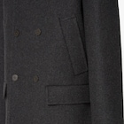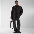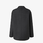 雙排釦外套搭配襯衫衣領和垂肩長袖。斜貼的貼邊暖手口袋和正面下方位置的貼片口袋。無襯裡。黑色雙層混色羊毛氈製成。