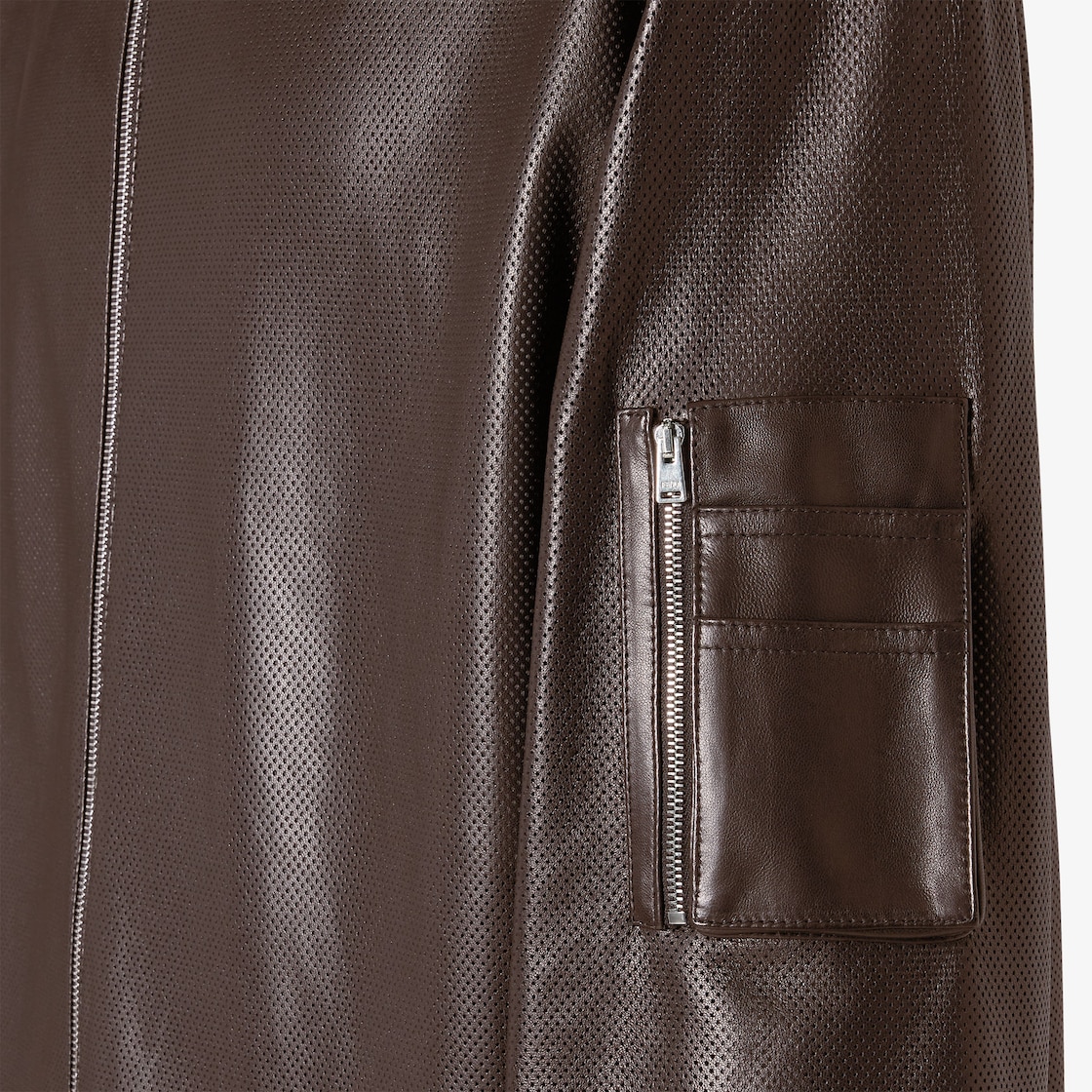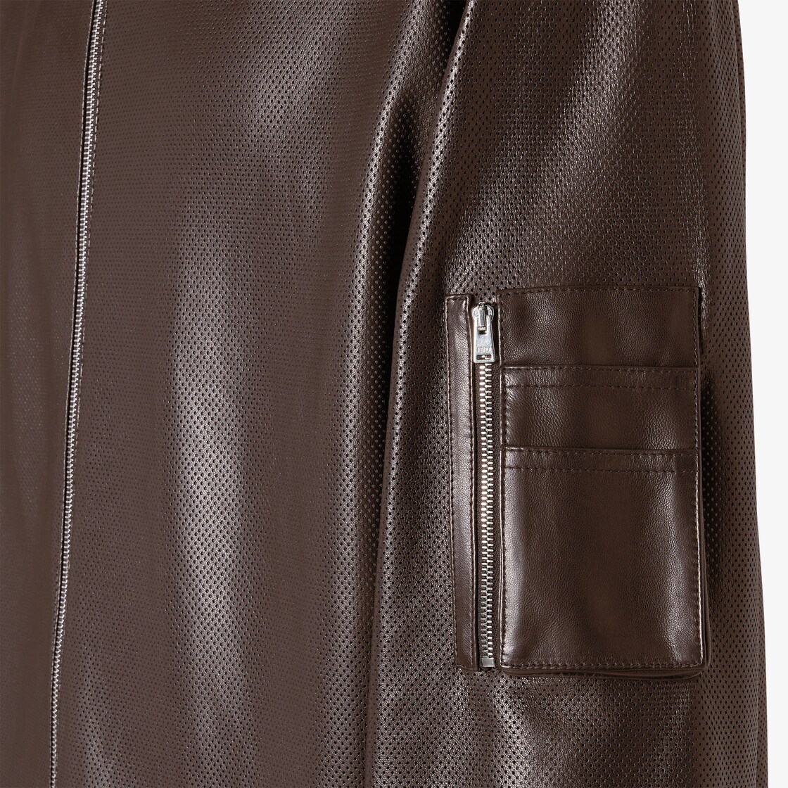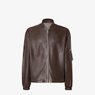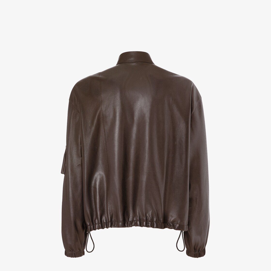 夾克搭配中山領和背面下擺索繩邊緣設計。長袖垂肩設計,搭配鬆緊袖口。無襯裡。金屬拉鏈開合。柔軟的深棕色微孔納帕軟皮製成。左側衣袖配有附卡槽的拉鏈口袋。背面綴有相襯顏色的Selleria FF細節的皮革貼飾。