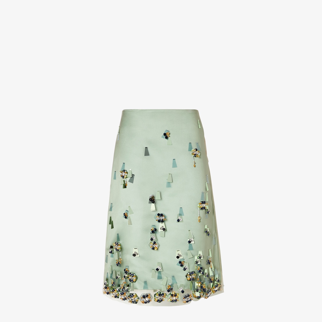 直筒半身裙採用中腰設計。有襯裡。拉鏈開合。灰綠色真絲洋緞製成。綴有手工刺繡:以不同形狀和大小的水晶營造出深度和動感,而以水晶裝飾的布料形狀則彷彿從表面浮現,並逐漸融入漸層效果之中。