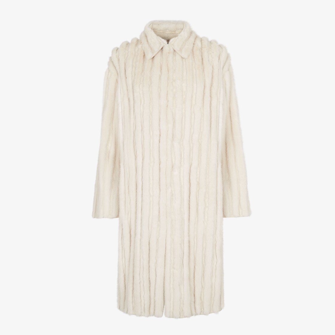 中長款外套,搭配恤衫衣領和長垂肩衣袖。珍珠白色貂皮製成。特殊的「羽狀」設計讓單品極為輕盈。