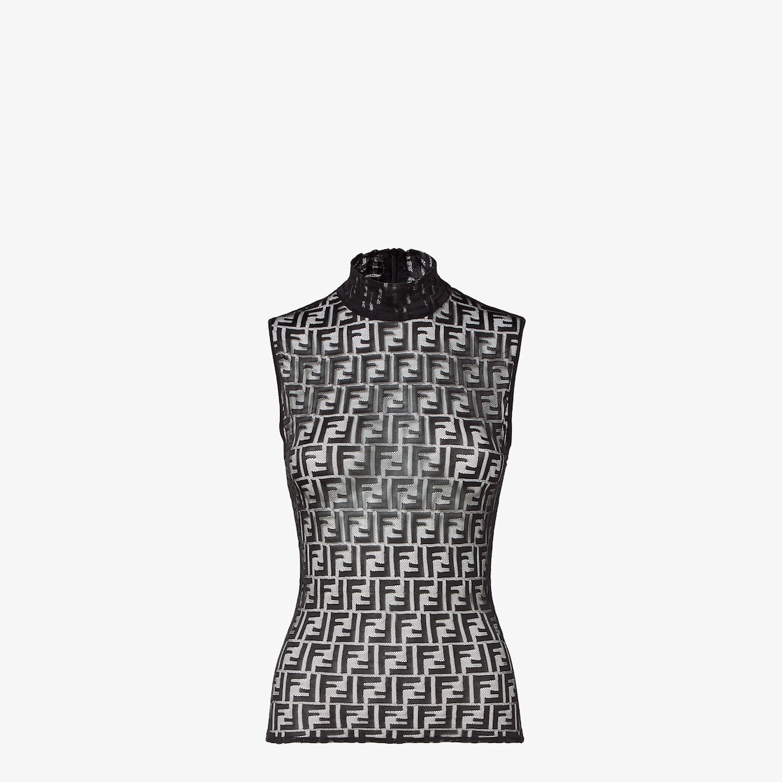 高領無袖上衣。合身。黑色平紋針織蕾絲製成,飾有滿版經典FF圖案,營造出透視效果。無襯裡。