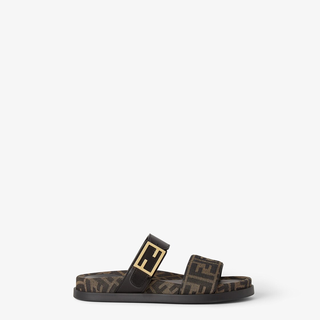 雙搭帶平底外出拖鞋,飾有FF Baguette裝飾性搭扣。提花布料製成,飾以經典FF圖案和黑色納帕軟皮細節。金色飾面金屬製品。