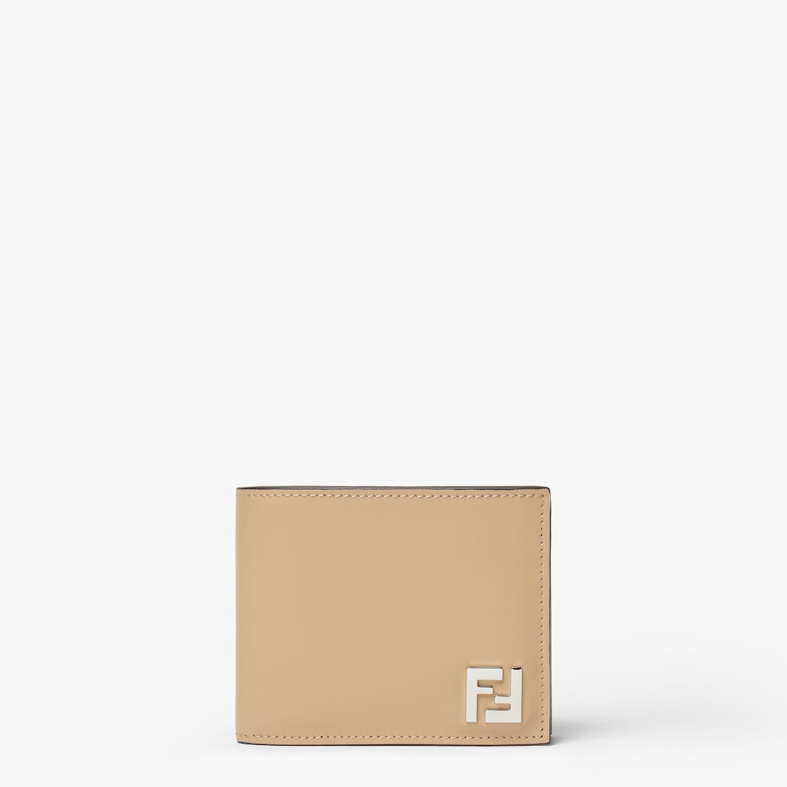 皮夾內有四個信用卡夾、兩個鈔票隔層和一個按扣開合式內部零錢袋。背面有平貼口袋。米色皮革製成,搭配米色FF Canvas細節。鈀色飾面金屬FF Squared圖案。