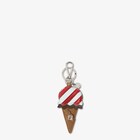 包款吊飾採獨特的冰淇淋甜筒造型設計。鑲嵌皮革製成,飾以淺藍色和紅色斜條紋圖案。搭配棕色皮革嵌飾、甜筒上的絎縫圖案和金屬FF細節貼花。鈀色飾面金屬製品搭配標誌彈簧扣。