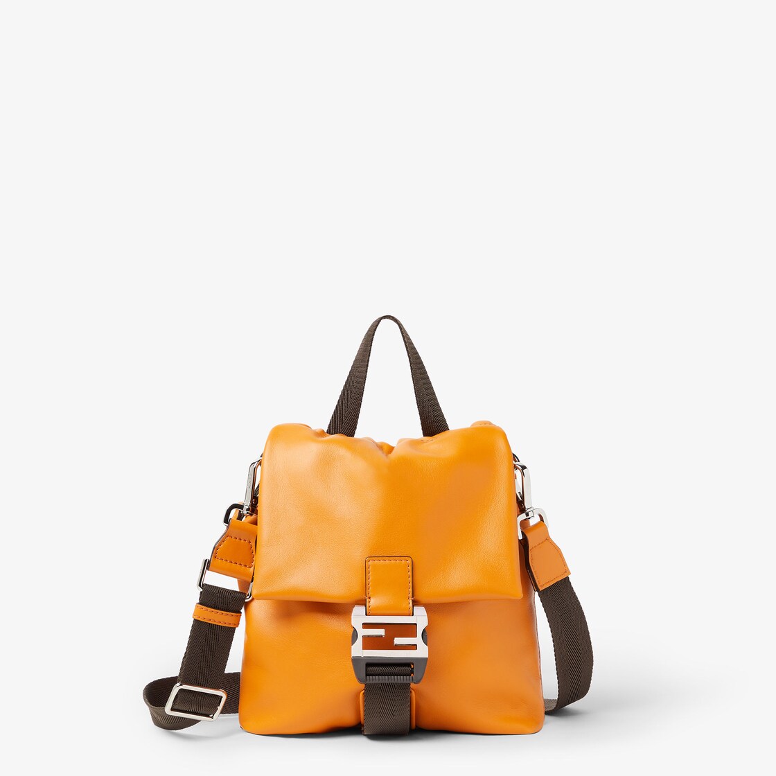 FENDI Flux斜背包款,以光滑橙色小牛皮製成。翻蓋飾有金屬FF鉤扣,中央索繩附特製繩帶。