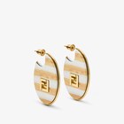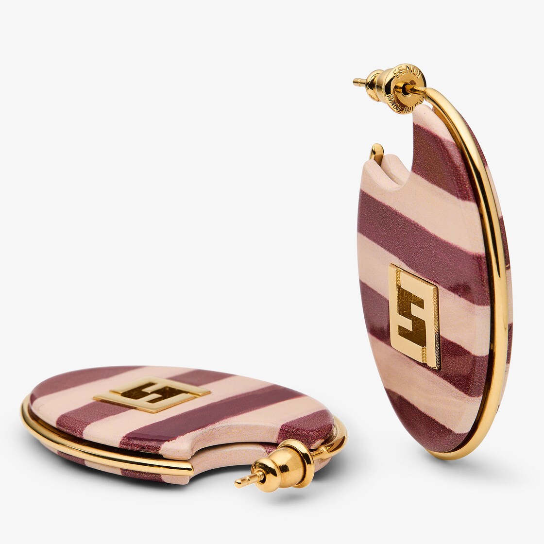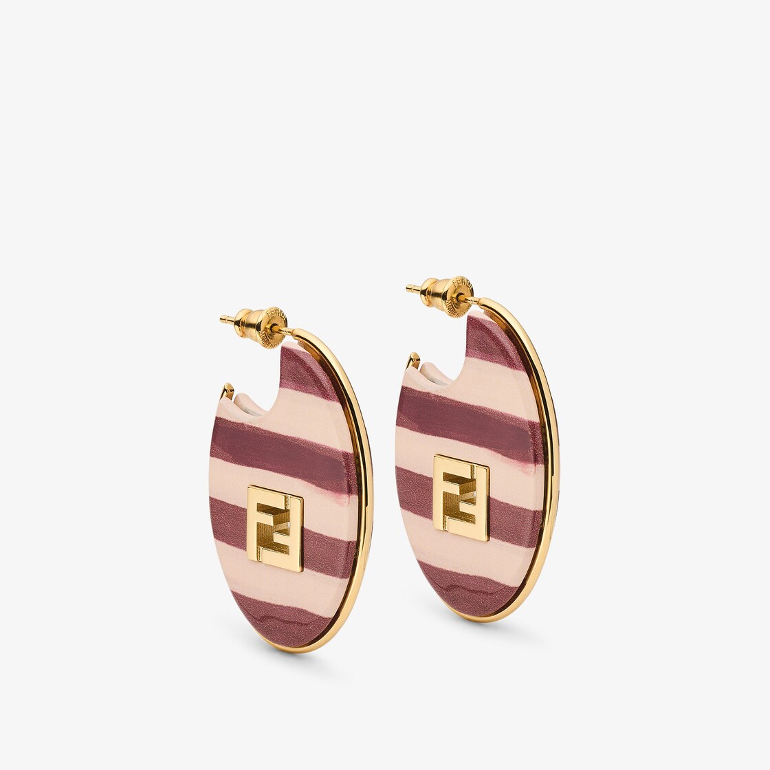 橢圓形圈圈耳環,綴以金色飾面金屬製成的鏤空FF標誌。樹脂製成,飾有粉紅色與深櫻桃紅色的經典Pequin圖案。