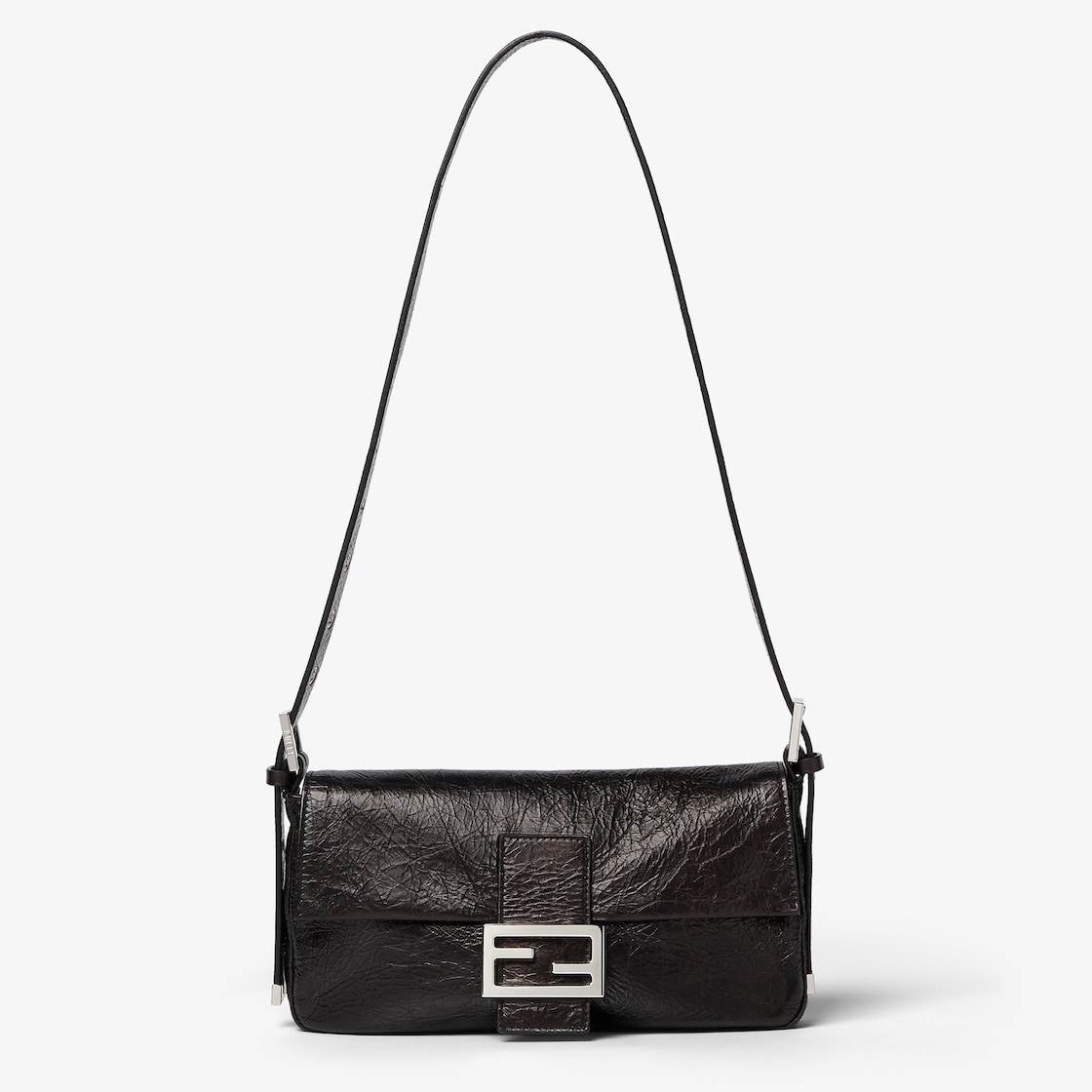 自1997年以來,這款包款一直是FENDI體現大膽創意的標誌性作品,這一季參照其原始款式(編號26424)重新演繹,在2026-27 FENDI秋冬系列隆重登場。包身採用黑色裂紋小牛皮製成,搭配完全可調式且可拆除的手柄和肩帶,展現百搭多樣的風格,並飾以標誌性的鈀色飾面FF搭扣。正面翻蓋採用磁扣開合,搭配全襯裡內部、一個拉鏈內袋和鈀色飾面金屬製品。