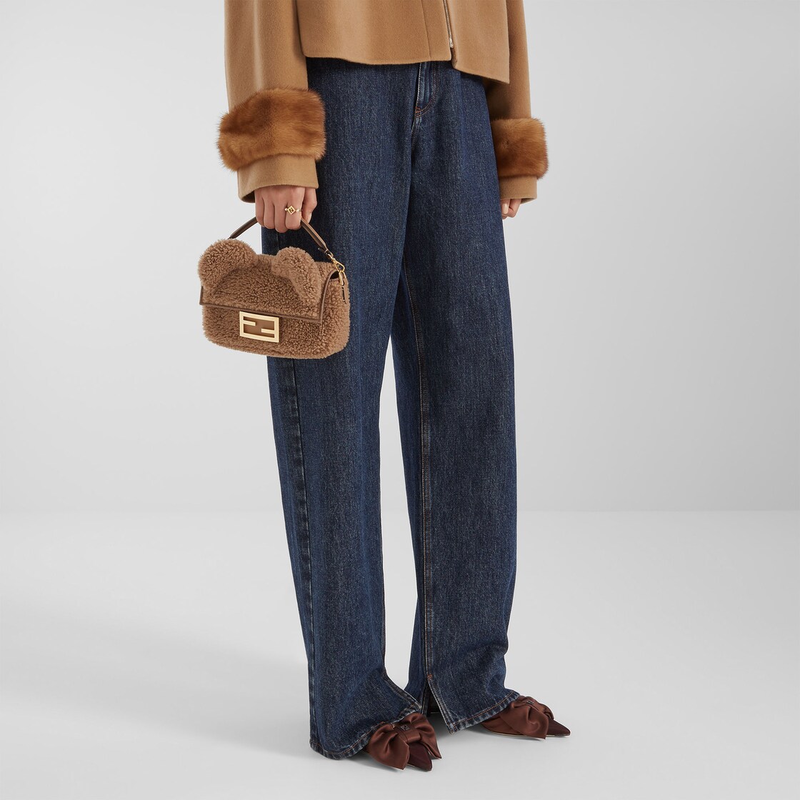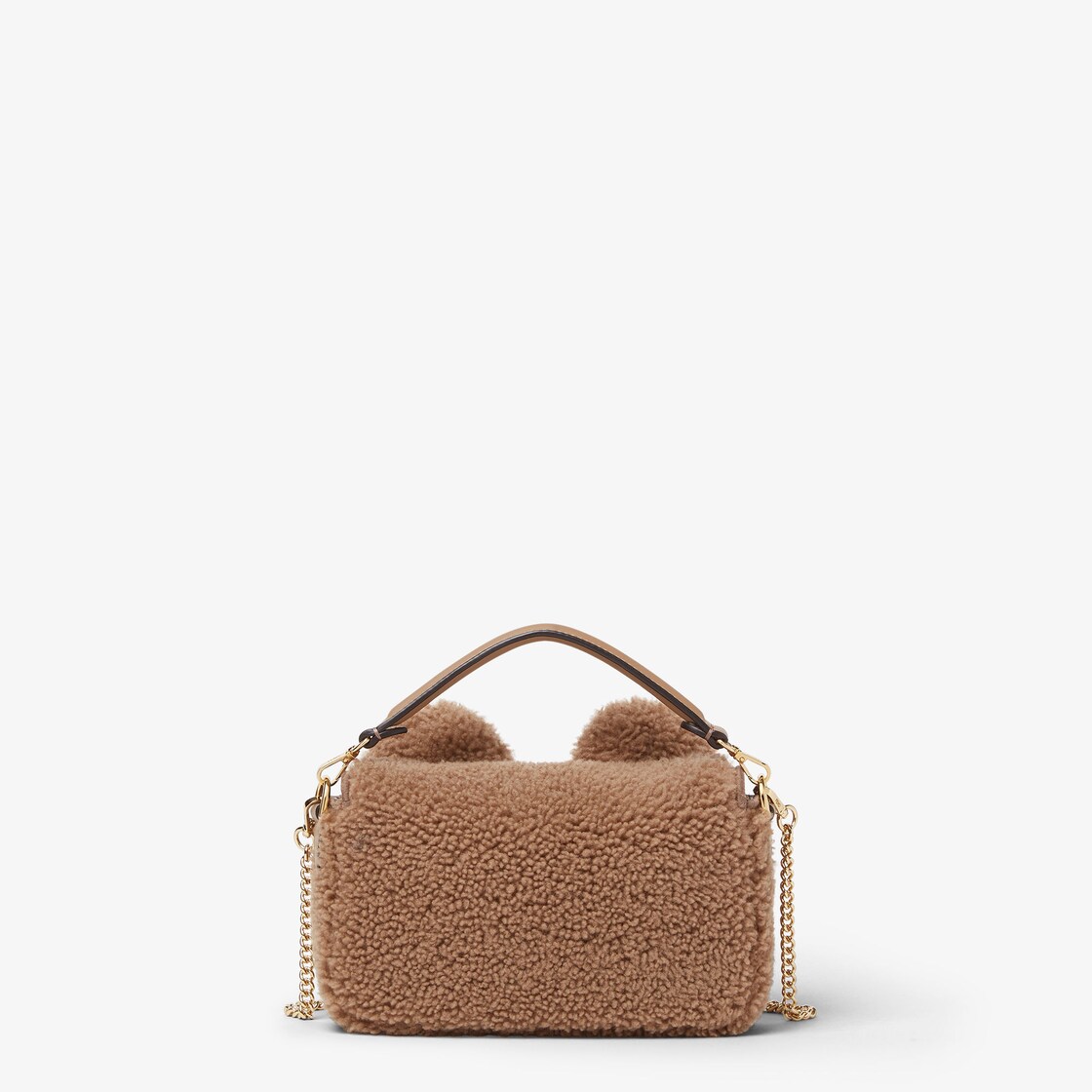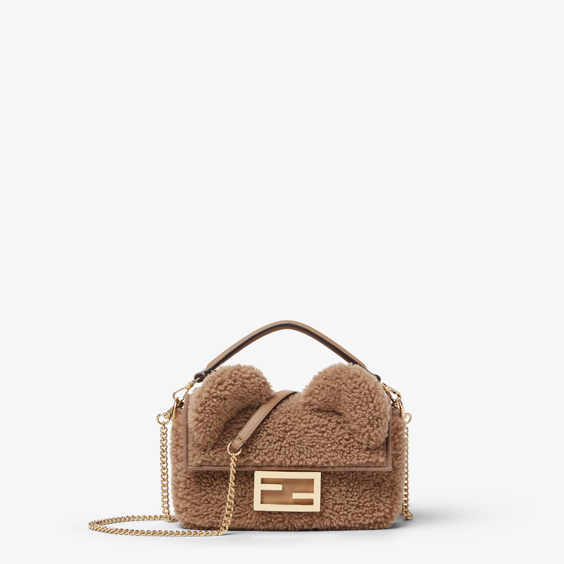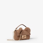 經典迷你款式Baguette®包款以米色捲曲翻羊毛製成,飾有兩個柔軟泰迪熊耳朵和FF鉤扣。
