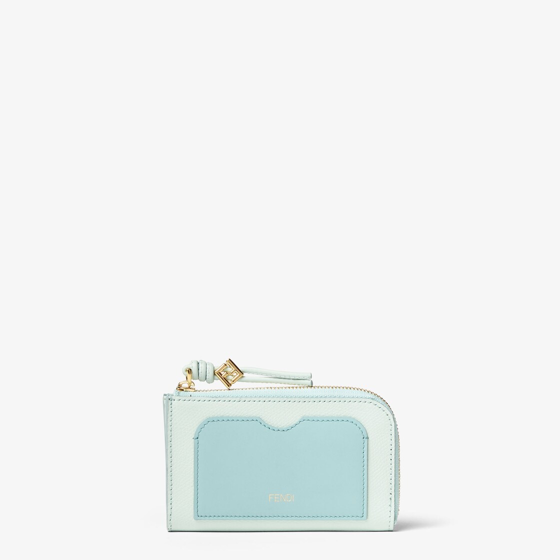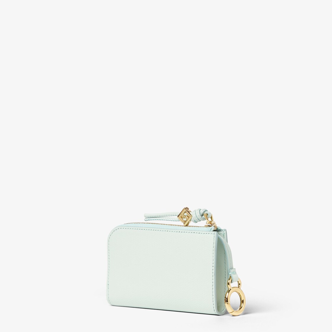 FF Diamonds卡片夾小包,附兩條側邊拉鏈。淺綠色全粒面皮革製成,搭配光滑藍綠色皮革的正面卡片口袋。同色系皮革拉鏈頭,搭配FF Diamonds元素。附彈簧扣可繫於包款上。金色飾面金屬製品。