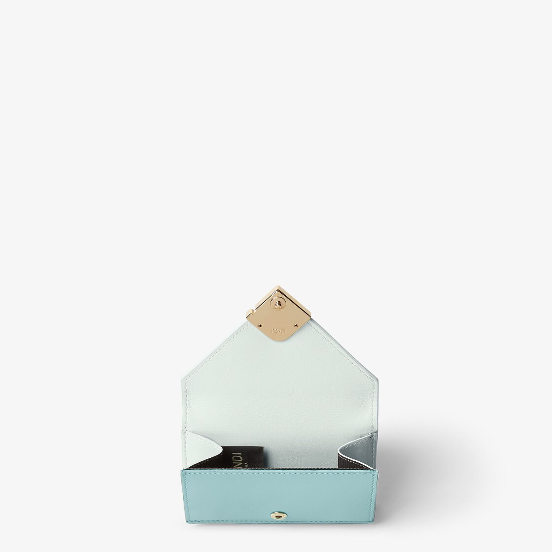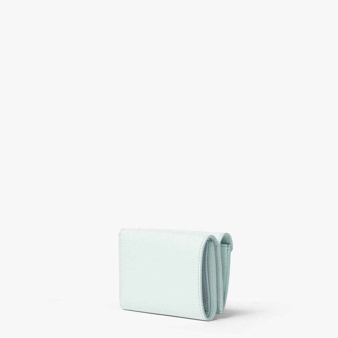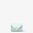 小巧三折FF Diamonds皮夾,內有大型內隔層可裝鈔票、六個卡槽和一個按釦開合的外側零錢包。以藍綠色與淺綠色的光滑小牛皮及全粒面皮革製成。金色飾面金屬製品和FF Diamonds標誌。