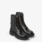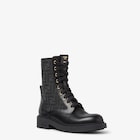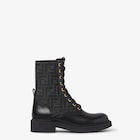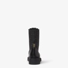 FENDI Filo騎士靴搭配圓形鞋頭。黑色皮革和彈性布料製成,飾有黑色經典FF圖案。綴有金屬孔眼、FENDI Roma字樣和金色飾面Selleria金屬縫線。橡膠鞋底和鞋跟側邊飾有FENDI字樣。
