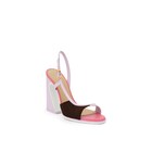不對稱涼鞋,採寬鞋跟設計,呈現經典Arco造型。淺藍色針織和深棕色納帕軟皮製成。黃色和深棕色FF雙色橡膠鞋底,搭配深棕色橡膠鞋跟。鞋跟飾有漆面淺綠色金屬細節,並刻有FENDI標誌。