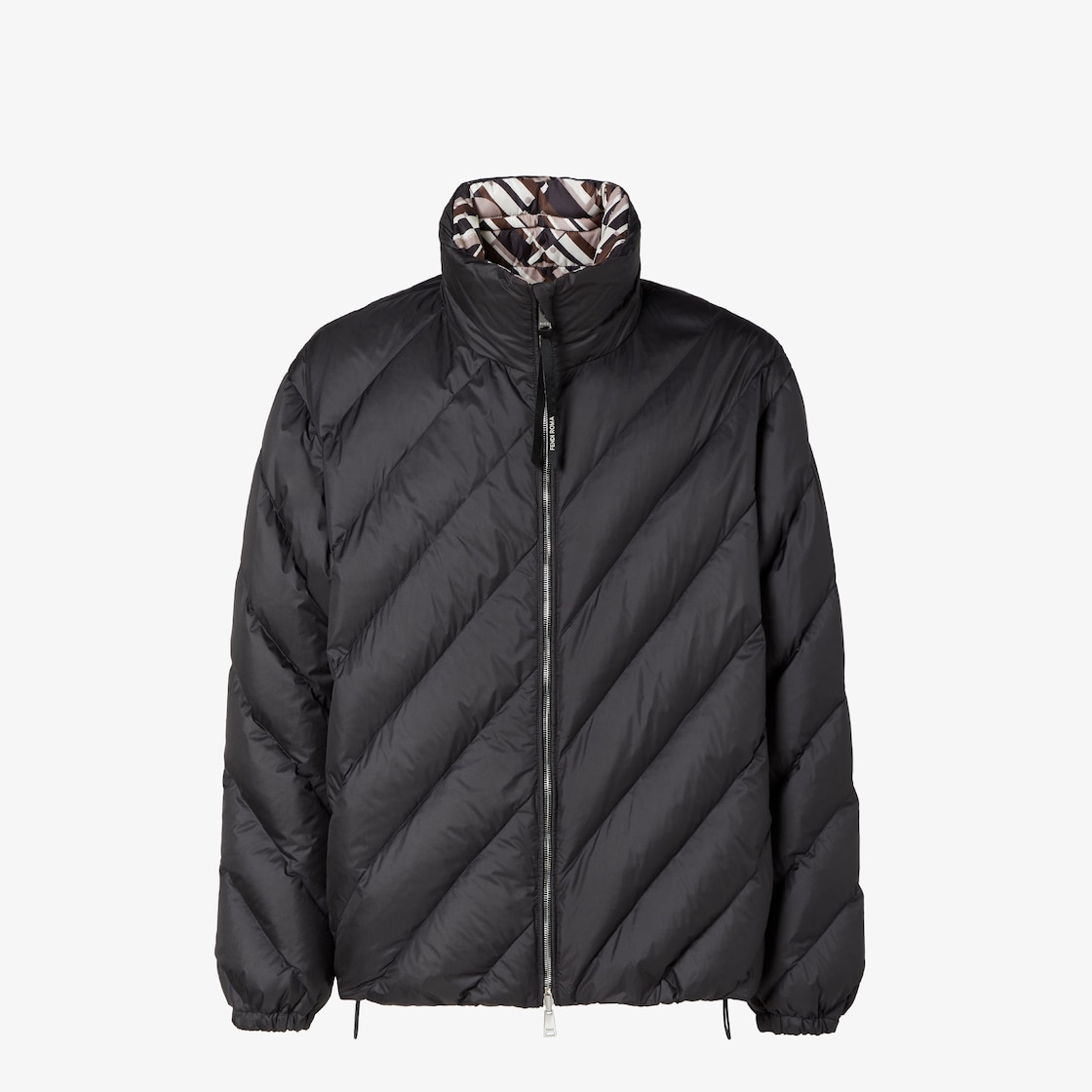 長袖羽絨外套,搭配可收納於高領內的連帽設計,並設有拉鏈開合。彈性袖口和索繩下襬。前有雙拉頭拉鏈設計。採黑色尼龍製成,搭配絎縫的人字紋和衣領背面的皮革FENDI Roma貼片。內層飾有不同棕色色調的滿版FENDI Tape印花。鈀色飾面金屬製品。