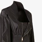 方形衣領短裙,搭配彈性腰際設計。羅紋衣領與袖口。正面採用兩個金屬拉鏈開合設計。黑色真絲塔夫綢製成。鈀色飾面金屬製品。