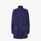 高領中長連帽外套,搭配下垂式寬袖設計。可調整服裝版型,透過扣眼調整腰身的嵌入式鬆緊帶,創造出立體蓬感輪廓。腰間、側邊和蜂腰小裙襬有口袋。背面中央開衩,採隱藏式雙頭拉鏈開合設計。深藍色純棉府綢製成。側邊綴有三角布細節,左袖口飾有FENDI刺繡。