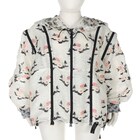 高領連帽外套,附索繩。可透過扣眼調整下擺嵌入式鬆緊帶,調整合身度並塑造立體造型。彈性袖口和雙拉頭拉鏈設計。深白色歐干紗蕾絲製成,並印有該系列粉紅色和黑色滿版FENDI Bouquet圖案印花。正面採不對稱雙向拉鏈圖案。