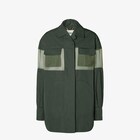 狩獵外套,採襯衫衣領設計,長袖配寬袖口。胸前設有翻蓋口袋,下襬有超大尺寸袋鼠口袋,背面亦有貼袋。隱藏式鈕扣開襟設計。由橄欖綠色科技gabardine布料製成。衣袖和胸前飾有同顔色半透明布料嵌飾。正面左側翻蓋上繡有同色FENDI標誌。