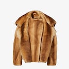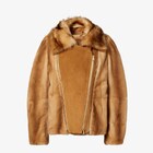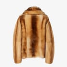 寬闊夾克,搭配大型襯衫衣領和長袖。側邊口袋。不對稱開合設計搭配金屬雙頭拉鏈。以翻羊毛和天然色調的「dorsato」貂皮混合製成。正面有鈀色飾面金屬拉鏈。