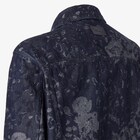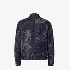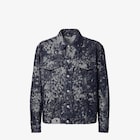 寬鬆版型外套搭配恤衫衣領,胸前有貼片口袋。無襯裡。鈕扣開合設計。藍色丹寧布料製成,飾有滿版Falena Drops提花圖案。衣領背面綴有標誌鈕扣和皮革貼片,飾有壓花FENDI Roma字樣。鈀色飾面金屬製品。